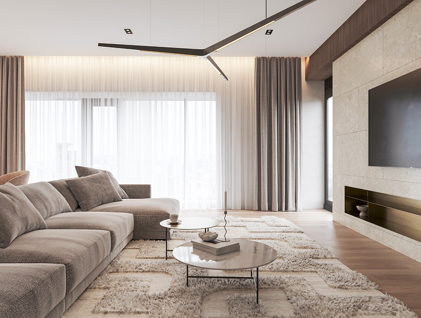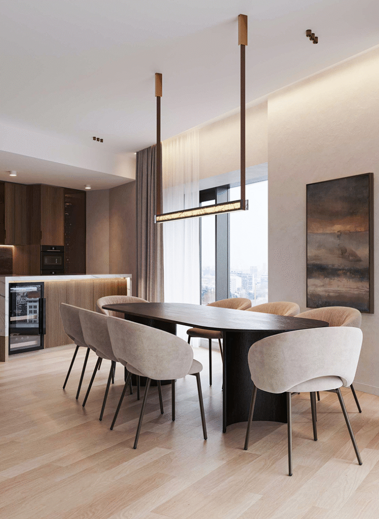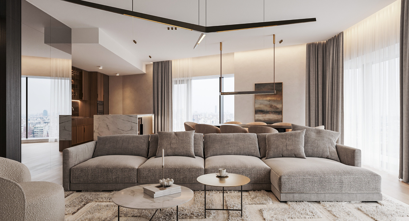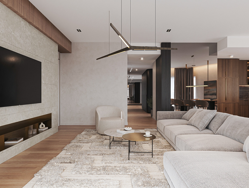A living space where timeless materials and soft geometry create quiet sophistication.